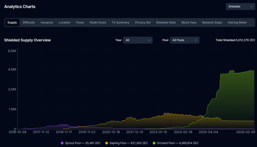 - ZEC shielded supply is stabilizing around 5,000 ZEC and hasn’t flinched in this bear market, showing users still care about private transactions. .