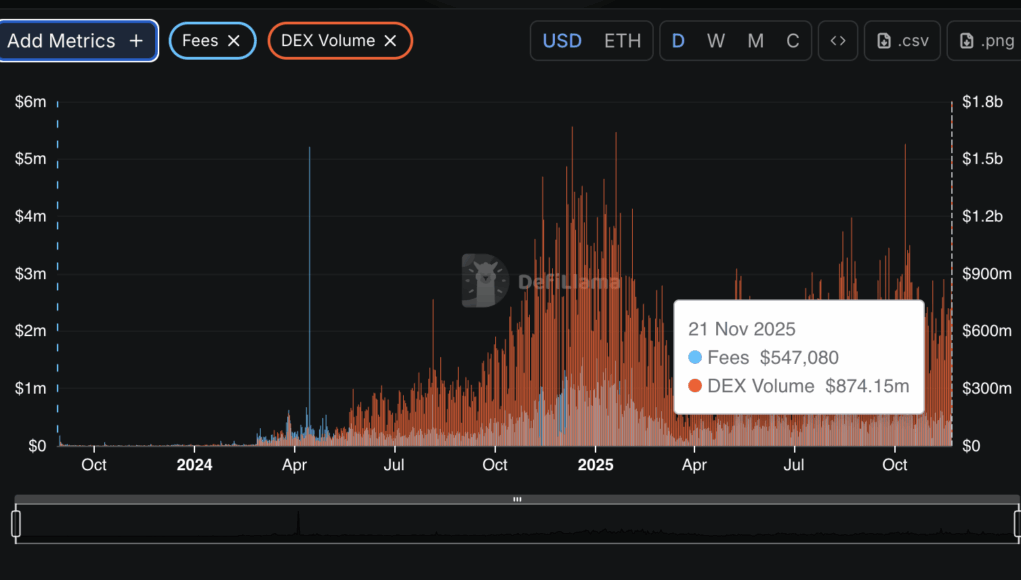 Aerodrome continues to play a central role on Base. It processes heavy swap activity, and recent DeFiLlama data showed about $874M in 24-hour DEX volume and roughly $547,000 in fees.