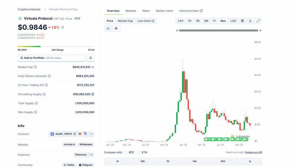 - Virtuals Protocol ecosystem valued at over $1Bn