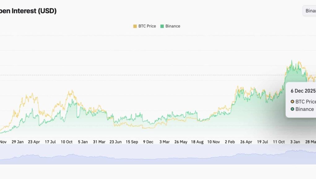 The calm spot trading hides a much busier picture in the futures market. CoinGlass shows Bitcoin futures open interest sitting near $56.5Bn.