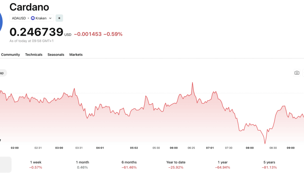 ADA is trading near $0.25 with a market cap of around $9Bn, according to current market data. That’s a network carrying real asset value, but the on-chain activity metrics tell a more complicated story in Cardano news today.