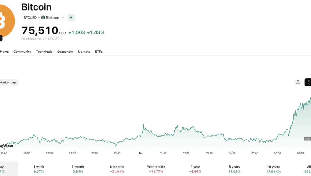 All of that is publicly confirmed. What X has refused to confirm or deny is whether blockchain infrastructure runs underneath any of it. However, the crypto market has bounced on Bier’s tease, with Bitcoin USD surging more than +5% overnight to $75,000.