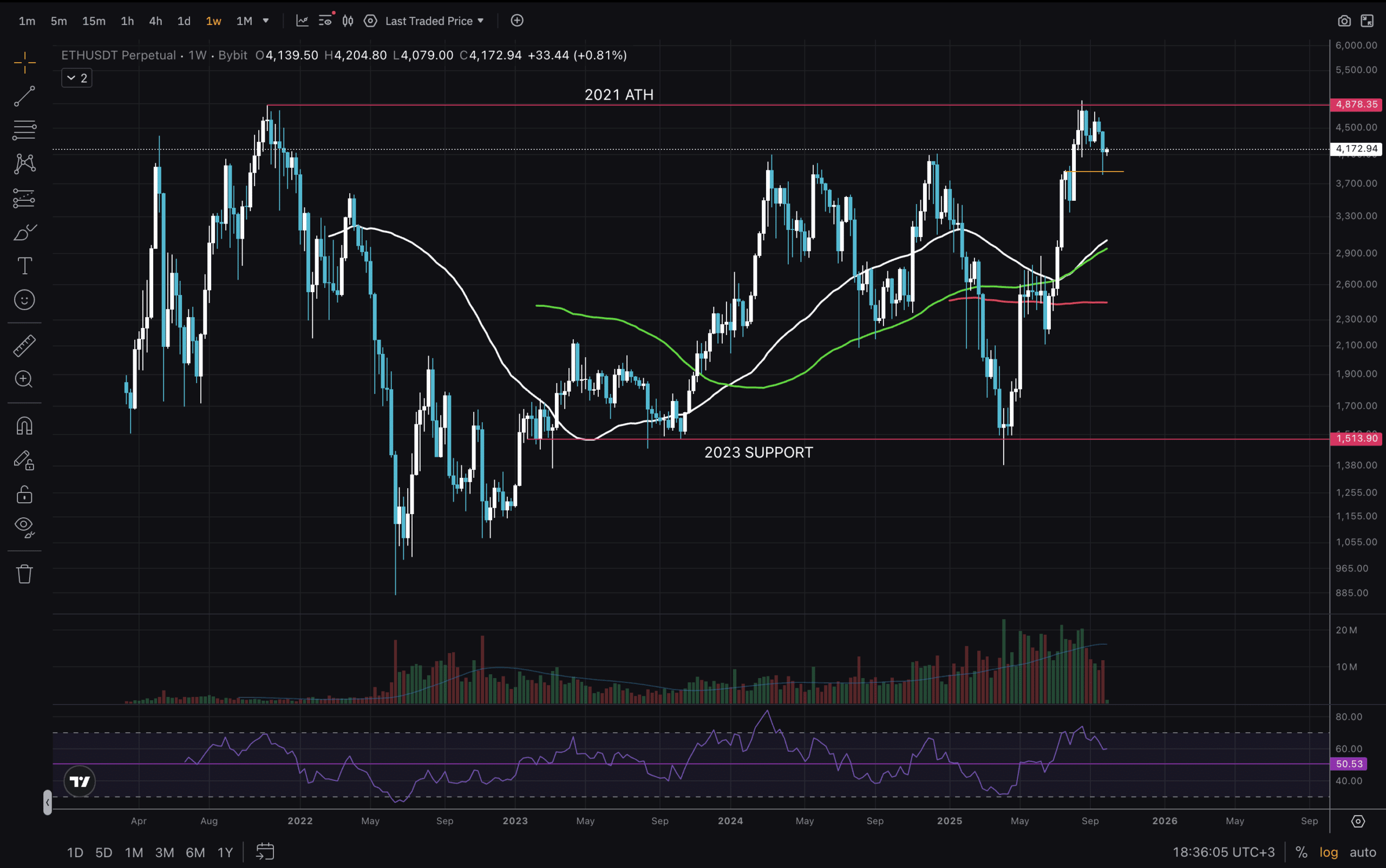 The first graph we will analyse is on the Weekly timeframe. The end of 2024 and in early 2025 we saw some wild volatility. And then volume grew as price went up to brake the 2024 high, which is currently acting as support. We are still to break and close above the 2021 ATH, which for many will be the start of the long awaited Alt Season. Being above the Moving Averages indicates our uptrend.
