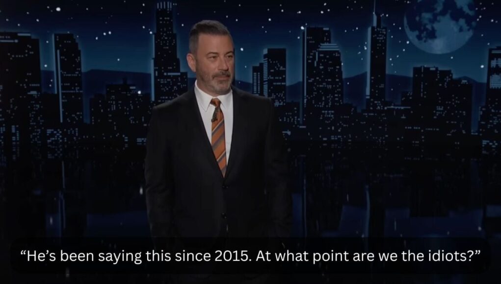 “He’s been saying this since 2015,” says Kimmel. “At what point are we the idiots?”