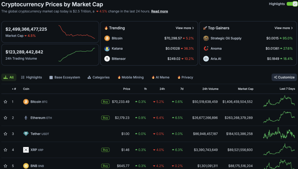 This news comes as the broader crypto market dropped -4.5% overnight, losing the crucial $2.5 trillion level, with Bitcoin flirting dangerously close to $70,000 after a -5.2% slump over the past 24 hours.