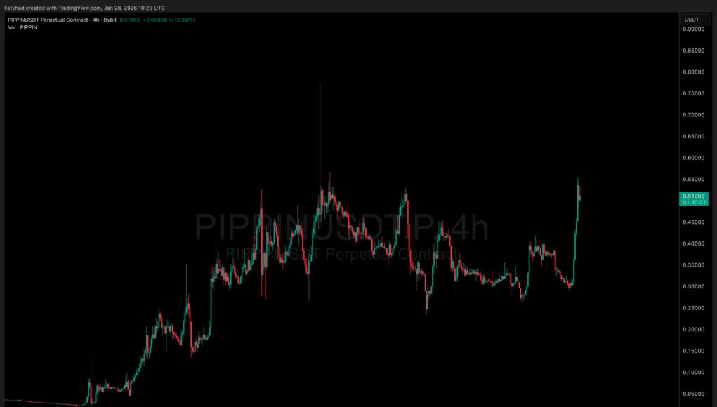 Pippin (PIPPIN) delivered one of the cleanest moves in recent memory, jumping more than 69% in a single day to reach roughly $0.55, now trading around $0.50, and pushing daily trading volume above $122 million. That rally took its fully diluted market cap comfortably past $500 million. But Pippin got us used to these crazy moves, with also very violent corrections.