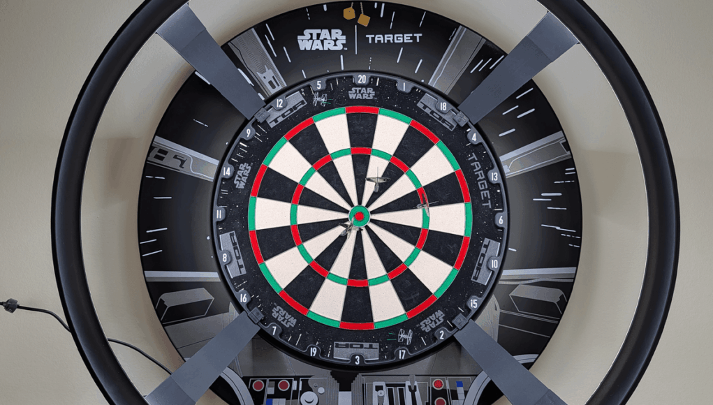 The Target Darts Omni Auto Scoring System pairs with the DartCounter app (Android or iOS). It’s quick and easy to put together, attaching to your board via magnetic legs, but you will need to run the power cable to an outlet. Connect to Wi-Fi, run a short calibration, and it’s time to play. I tested with Target’s Star Wars Millennium Falcon Surround and Dartboard ($200 or £150) and a set of Darth Vader Darts ($340 or £250)—both amazing Star Wars gifts for the fan in your life—but it should work with most boards and any darts.