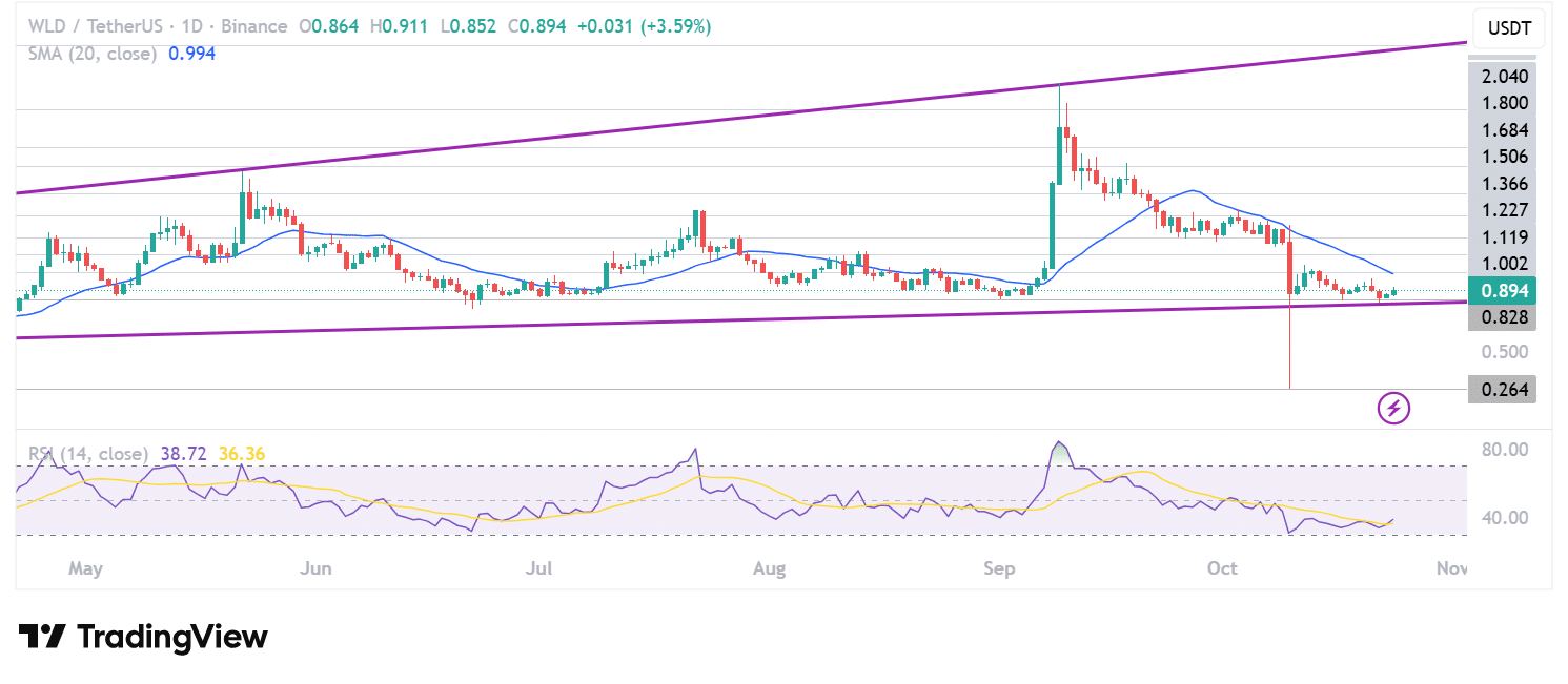 With price action showing little reaction to the Thai police raid, WLD continues to consolidate above the lower trendline support at $0.8, following the capitulative dip down to $0.26 on October 10.